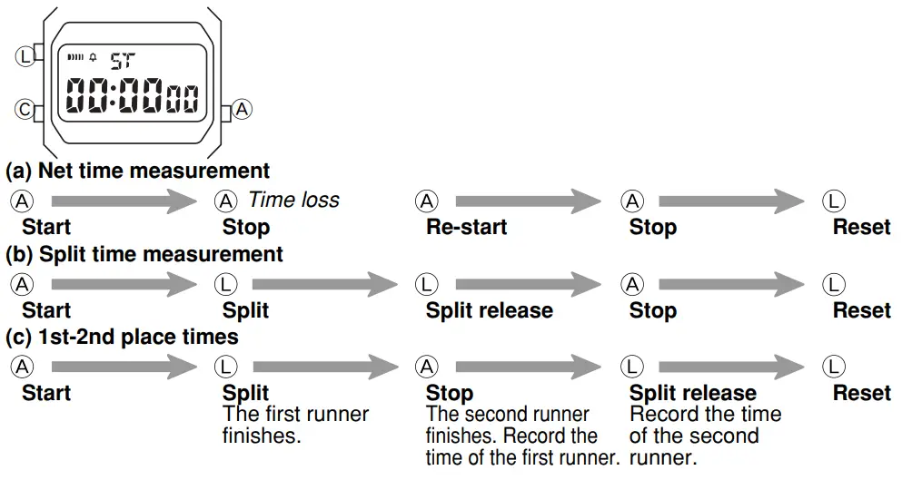 出典:https://manuals.plus/casio/f91w-casio-digital-wrist-watch-operation-manual#stopwatch_operation