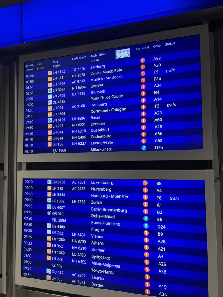 やっと到着しましたが、今回はさらに乗り換えがあるので、ボードで自分の次の便の搭乗ゲートを確認して移動します。