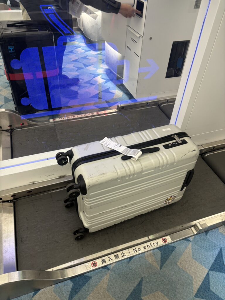 不慣れなので空港のスタッフさんにタグの巻き付けをお願いしてしまいました。